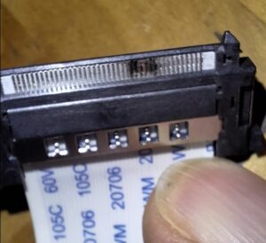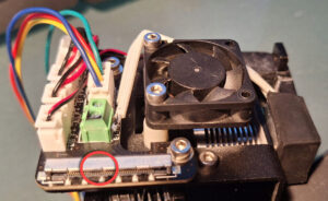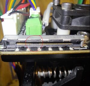 Jetzt kontrollierte ich das mitgelieferte Flachbahnkabel und wollte es erst garnicht ersetzen (für mich bestand der Fehler ja immer noch an einem defekten Mainboard 🙂 und dann fiel mir der Steckkontakt am Low Temperatur Hotend auf, das es dort stark schwarz verfärbte Leiterbahnen gab..